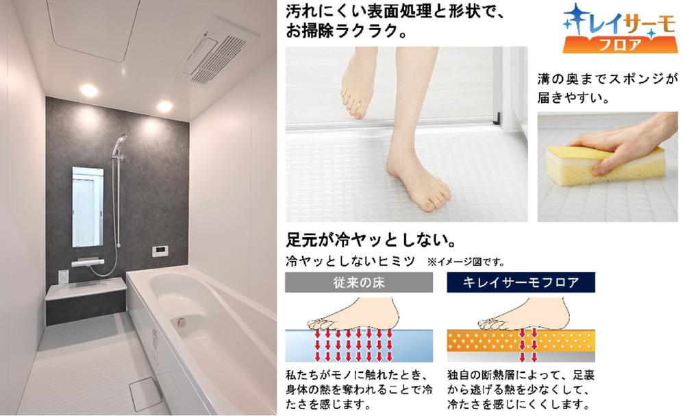 浴室には、足元がヒヤッとせず、お手入れもしやすい「キレイサーモフロア」を採用。お風呂の床が冷たく感じにくい断熱性能と、皮脂汚れなどがつきにくく、お掃除しやすい特殊加工が特徴のユニットバスの床材です。冬場もヒヤッとせず快適で、日々の清掃も楽に♪