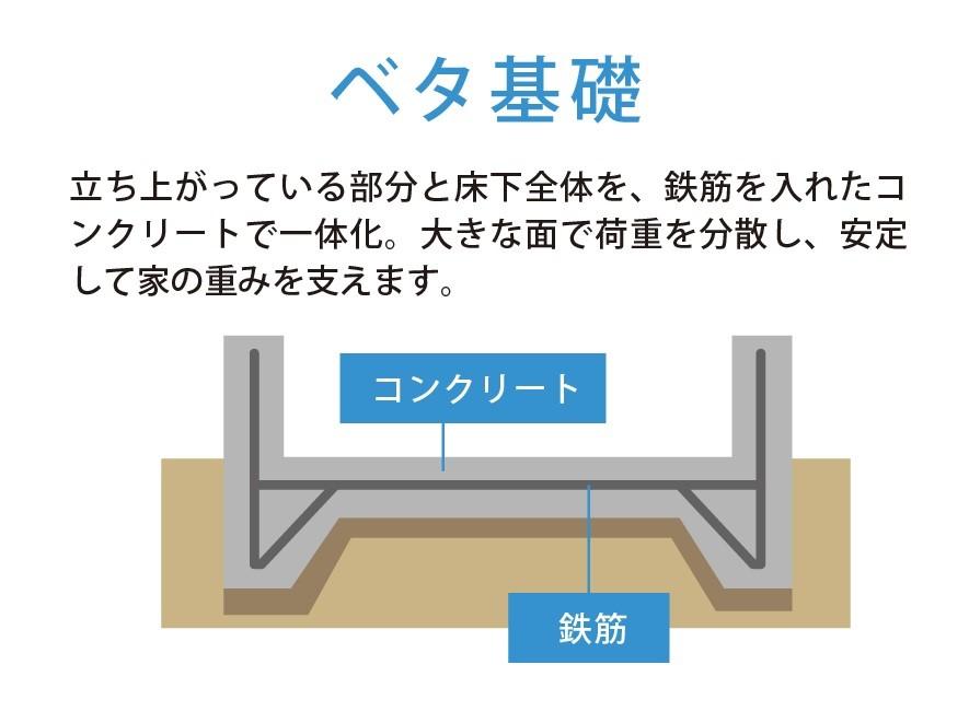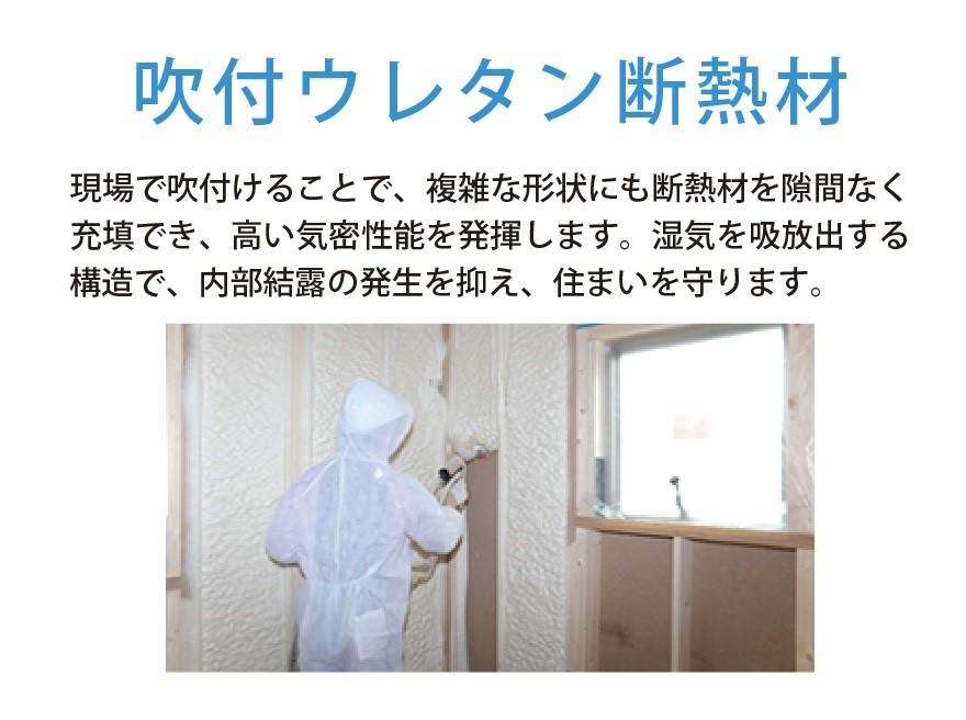 壁面・小屋裏にはグラスウールやロックウール等の繊維系断熱材よりも隙間なく施工しやすく、複雑な形状の場所でも充分な密度で断熱性を保てる「現場吹き付け発砲断熱」を採用。床面には環境負荷低減にこだわった床断熱用エコ資材を採用しています。