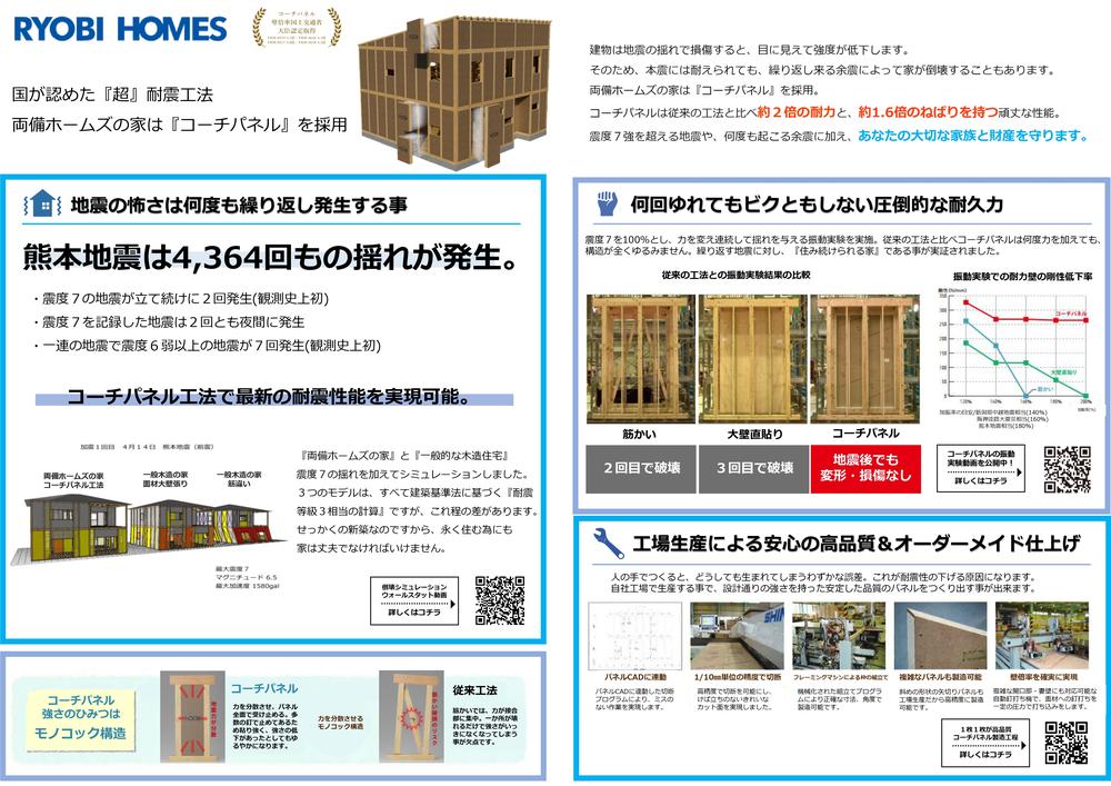 【コーチパネル】建物は地震の揺れで損傷すると、目に見えて強度が低下します。そのため本震は耐えられても繰り返し来る余震によって家が倒壊することもあります。コーチパネルは従来の工法と比べ約2倍の耐力と1.6倍のねばりを持つ頑丈な性能。両備ホームズの建売は震度7を超える地震や、何度も起こる余震に耐えあなたの大切な家族と財産を守ります。