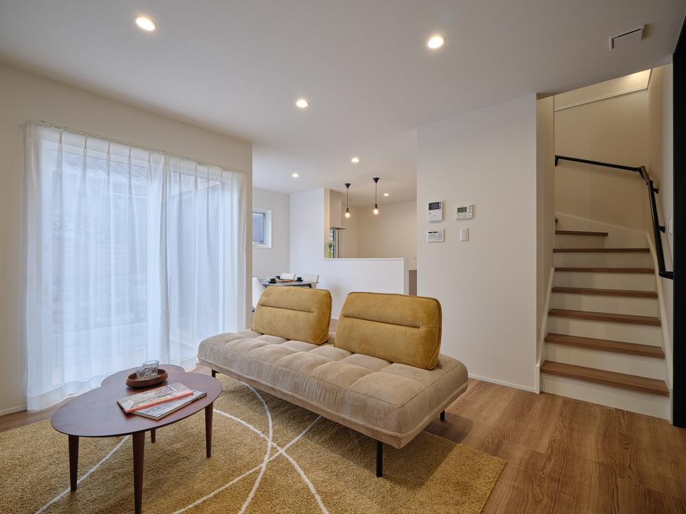 17帖の広々としたLDKは、リビングとキッチンダイニングが緩やかに分かれた設計。家族それぞれが心地よく過ごせる工夫が満載!。プライベートな時間を大切にしつつ、自然と会話が生まれる空間を提供いたします。