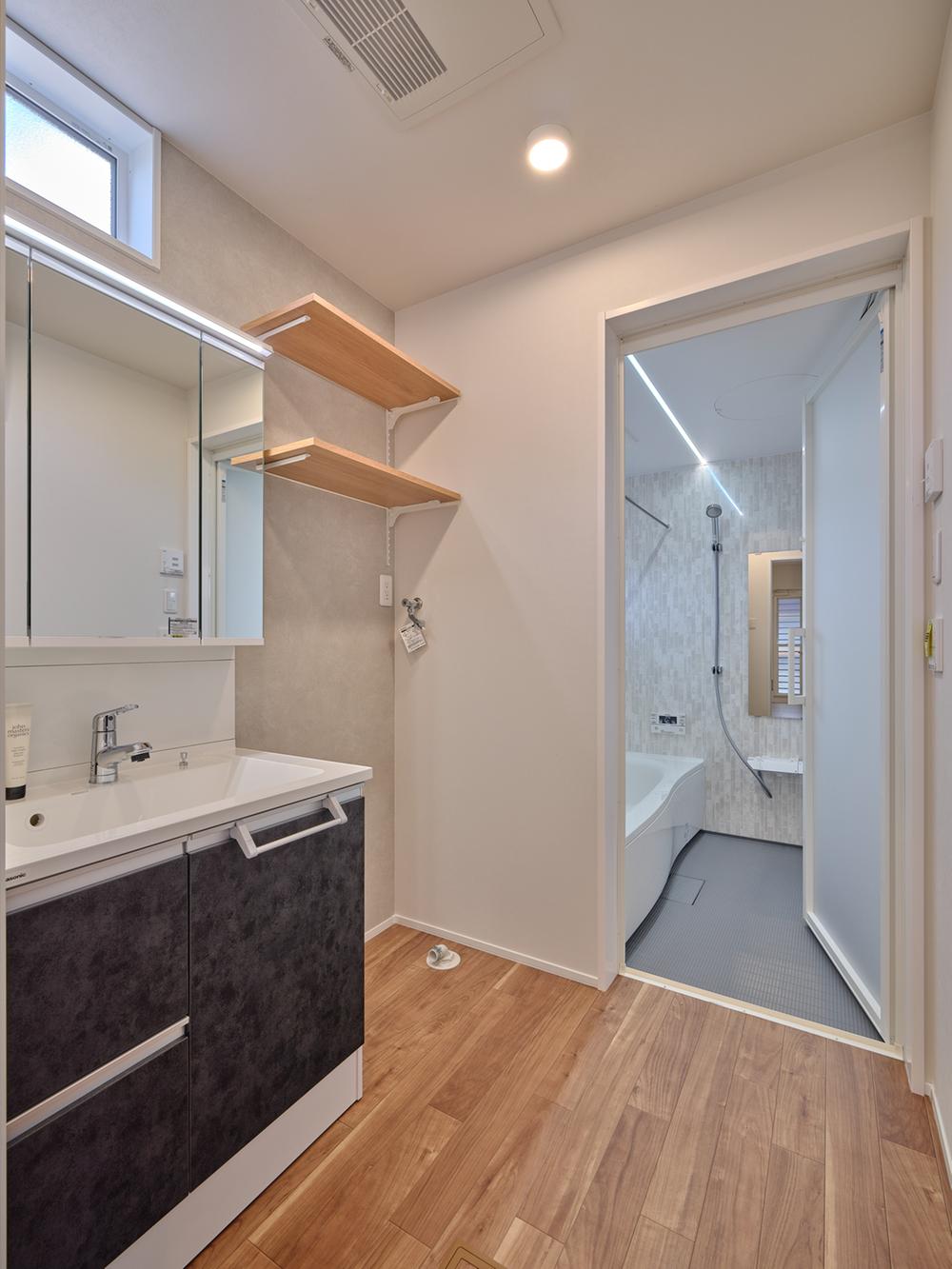 使いやすさが魅力の洗面脱衣所。3面鏡独立洗面台・可動棚付き階段下収納・洗濯機置き場&上部に可動棚と内容が十分に集約された水回りエリア。収納力が高く、洗剤ストックや普段着の収納に便利です。