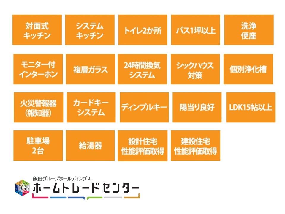 | 設備 | 長期優良住宅認定通知書 / 設計住宅性能評価書 / 建設住宅性能評価書(新築時) / フラット35・S適合証明書 / 省エネルギー対策 / フラット35Sに対応 / 地盤調査済 / 駐車2台可 / 省エネ給湯器 / 山が見える / 避暑地 / 海まで2km以内 / システムキッチン / 浴室乾燥機 / 陽当り良好 / 全居室収納 / 南側道路面す / LDK15畳以上 / 総合病院 徒歩10分以内 / 角地 / 庭 / シャワー付洗面化粧台 / セキュリティ充実 / バリアフリー / トイレ2ヶ所 / 浴室1坪以上 / 2階建 / 複層ガラス / 全室南向き / オートバス / 温水洗浄便座 / 南庭 / 床下収納 / 浴室に窓 / TVモニタ付インターホン / 節水型トイレ / 緑豊かな住宅地 / 通風良好 / 全居室フローリング / 南西向き / パントリー(食器・食品の収納庫) / ウォークインクローゼット / 全室2面採光 / 高台に立地 / 小学校 徒歩10分以内 / ルーフバルコニー / テラス / 周辺交通量少なめ / 浄水器 | ||||