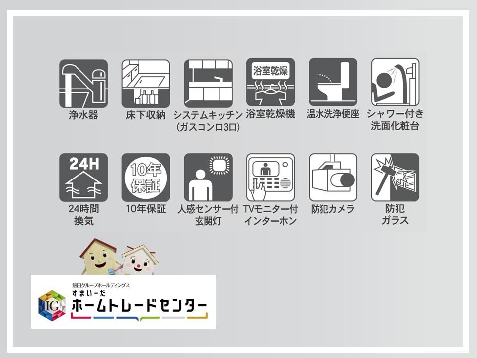 | 設備 | 設計住宅性能評価書 / 建設住宅性能評価書(新築時) / フラット35・S適合証明書 / 省エネルギー対策 / フラット35Sに対応 / 地盤調査済 / 駐車2台可 / 年度内引渡可 / 省エネ給湯器 / 市街地が近い / システムキッチン / 浴室乾燥機 / 陽当り良好 / 全居室収納 / 閑静な住宅地 / LDK15畳以上 / 前道6m以上 / 角地 / 和室 / 整形地 / シャワー付洗面化粧台 / 対面式キッチン / EV車充電設備 / バリアフリー / トイレ2ヶ所 / 浴室1坪以上 / 2階建 / 複層ガラス / オートバス / 温水洗浄便座 / 床下収納 / 浴室に窓 / TVモニタ付インターホン / 緑豊かな住宅地 / 都市近郊 / 通風良好 / 南西向き / 高台に立地 / ルーフバルコニー / 周辺交通量少なめ / 浄水器 / スマートキー / 高機能トイレ | ||||