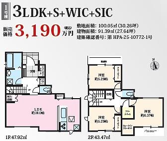 | 建物面積 | 91.39㎡(27.64坪)(実測) | 土地面積 | 100.05㎡(30.26坪)(登記) | ||