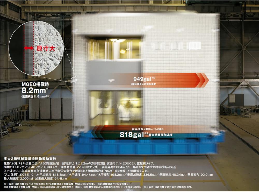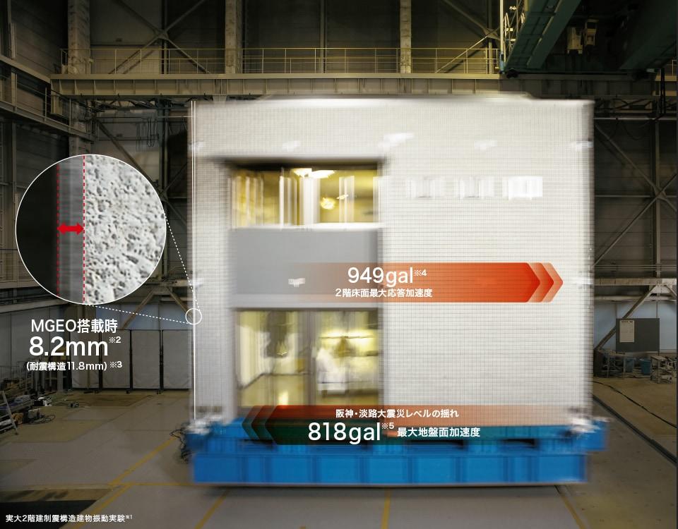 「MGEO」の効果は地震エネルギーを最大で約50%軽減でき、クロスなどの仕上げ材の損傷を低減しました。。その効果は、木質系住宅より重い一般的な「鉄骨ブレース構造」の建物と比較した場合、震度6弱の場合で変形量を約1/8に抑えられる計算になります。4日間で合計39回もの加振に対し、「MGEO」が最後まで有効に機能しました。これは、連続余震の不安をも解消します。