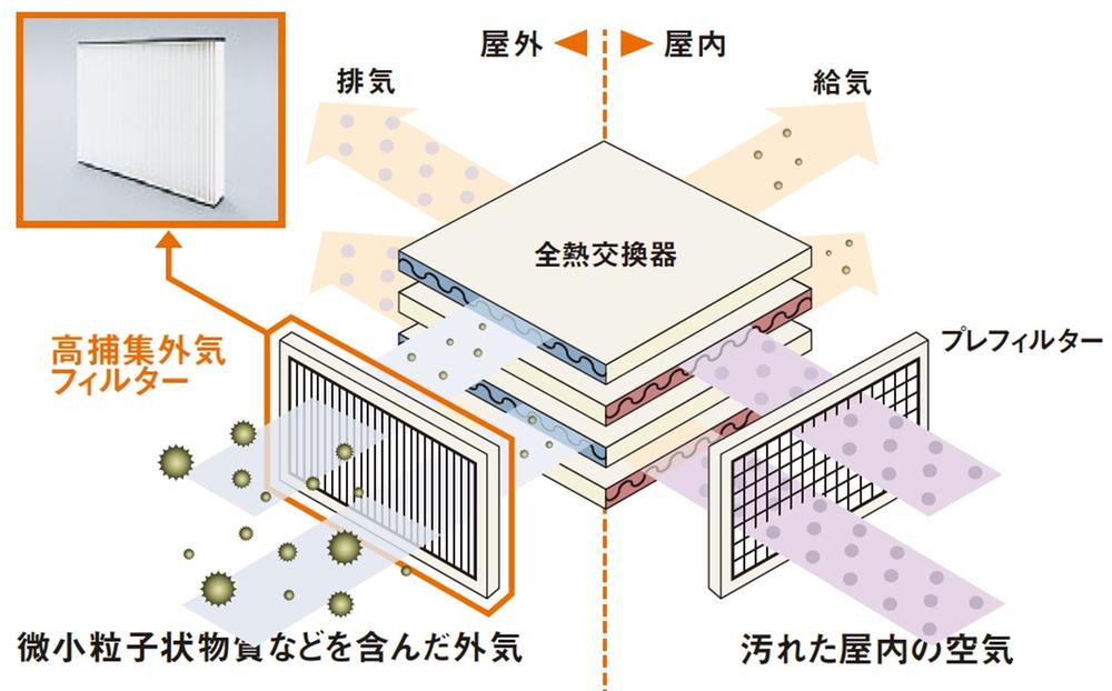 「熱交換型24時間フロアセントラル換気システム」に「高捕集外気フィルター」を搭載した場合、大気中に含まれるPM2.5などの大気汚染物質が換気により室内へ侵入するのを抑えることが可能です。
