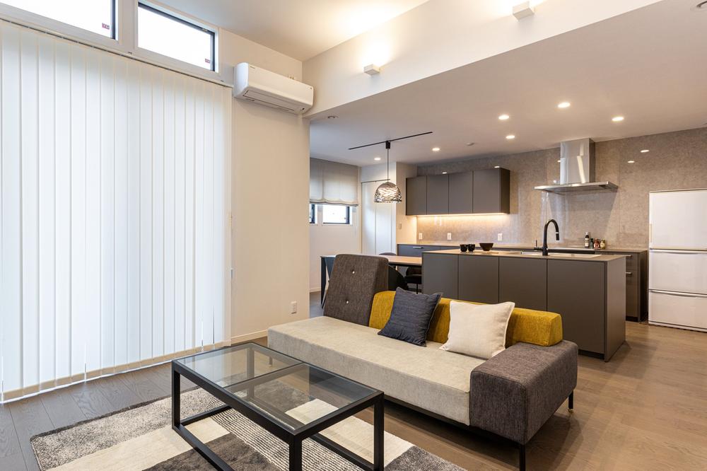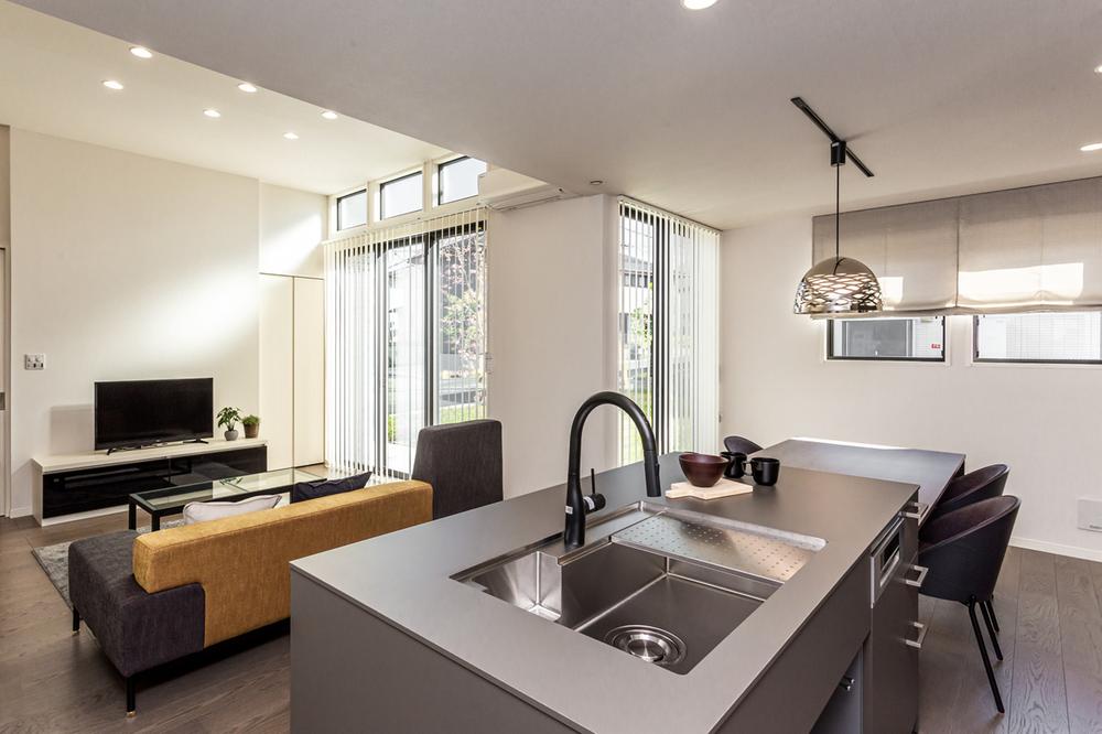 【LDK/約19.6帖】ご家族の憩いの場となるLDKは、広々約19.6帖。リビングには約3mの高天井を採用し、さらに開放感を演出しています。ハイサイドライトなど、室内各所の窓から明るい陽光が差し込みます。
