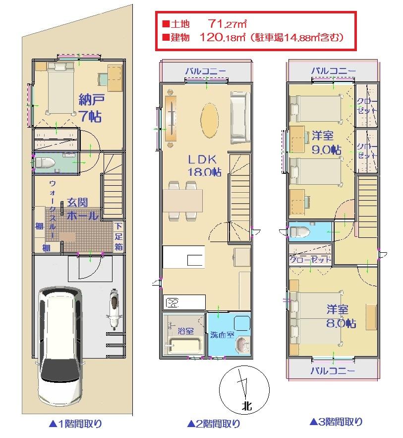 | 建物面積 | 120.18㎡、うち1階車庫14.88㎡ | 土地面積 | 71.27㎡ | ||