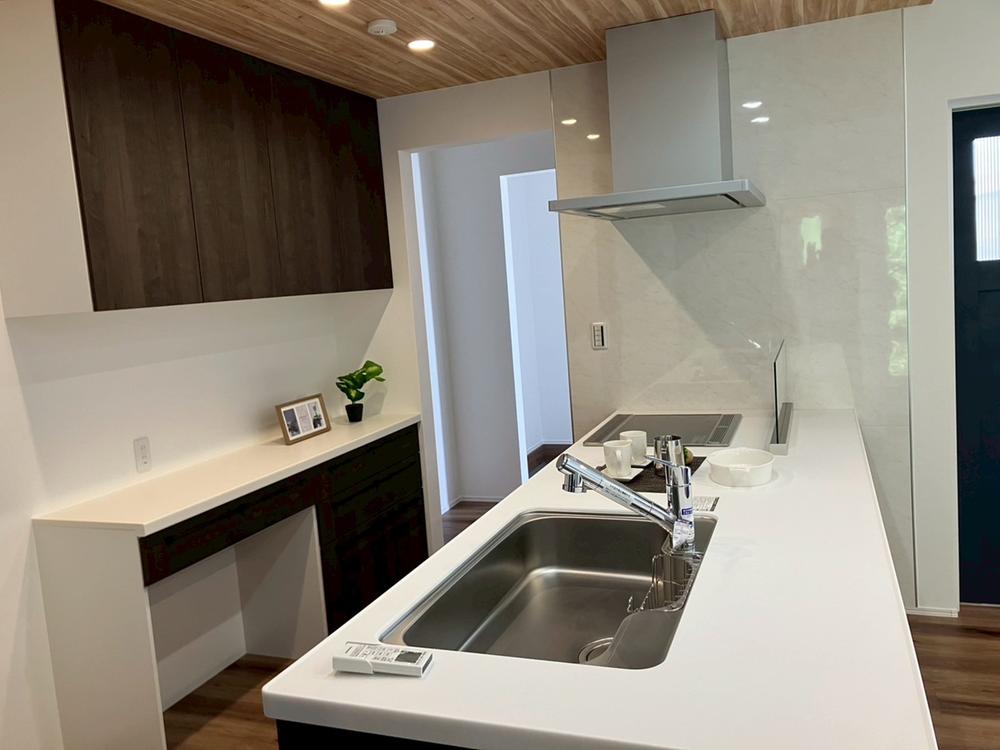 広々オープンキッチンと食洗器付き。さらにキッチンメーカーのカップボードを完備、ビルドインなので地震の際も倒れないしない安心設計です。