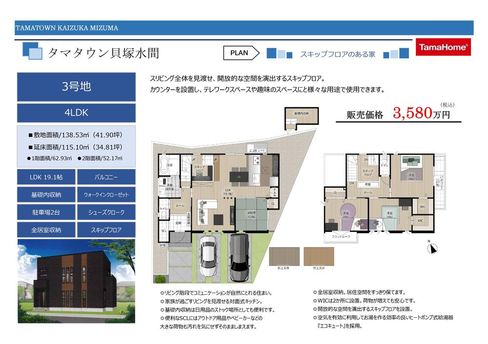 【3号地】価格3580万円LDK19.1帖 4LDK 駐車場2台土地面積138.53m2建物面積115.10m2