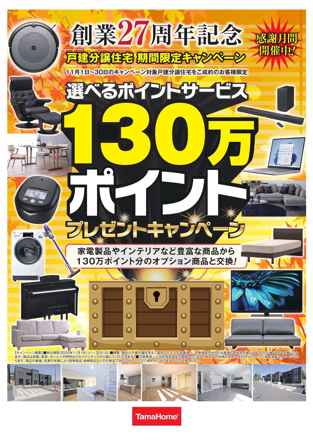 創業27周年記念 戸建分譲住宅 期間限定キャンペーン選べるポイントサービス130万ポイントプレゼントキャンペーン家電製品やインテリアなど豊富な商品から130万ポイント分のオプションと交換!