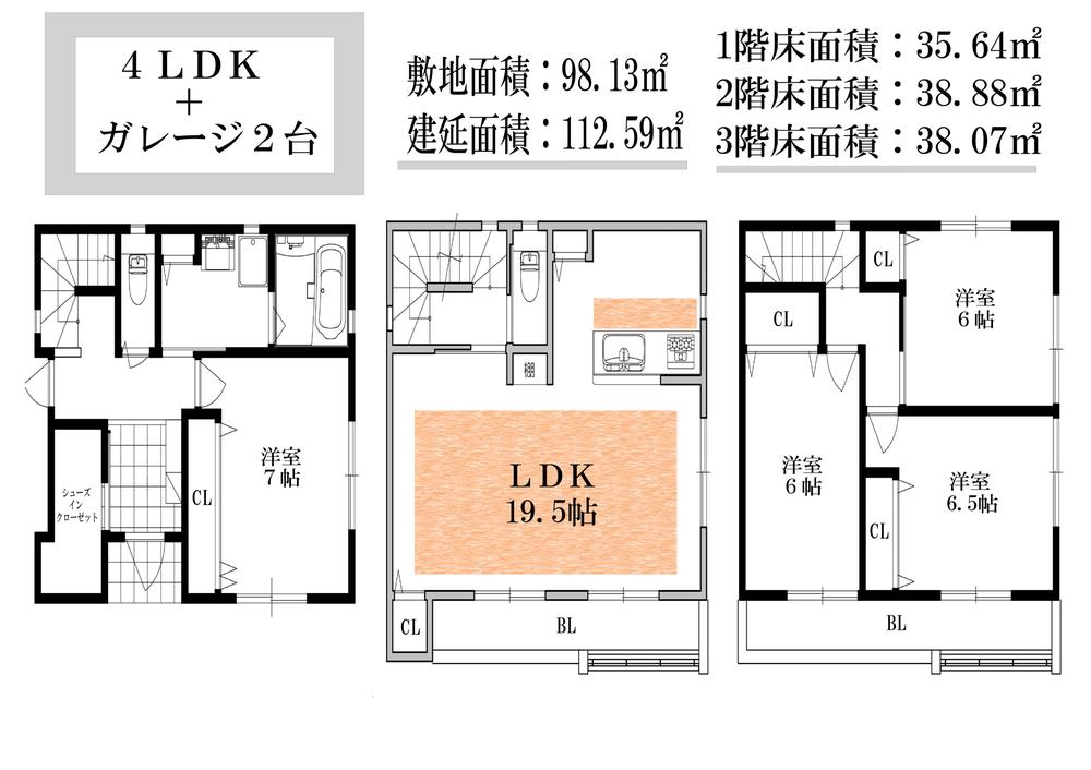 建物面積 | 112.59㎡~112.73㎡ | 土地面積 | 66.37㎡~98.13㎡ | ||