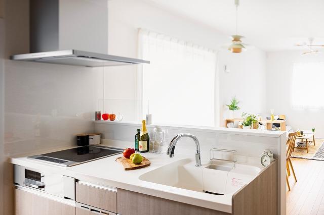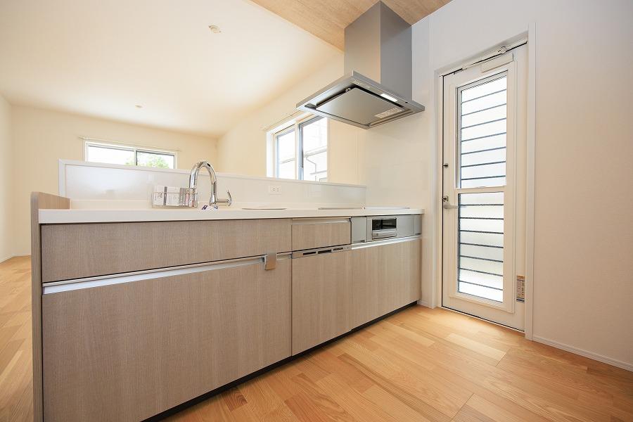 リビングとの繋がりを感じる開放的な半ペニンシュラキッチンには、時短&節水の叶うハンズフリー水栓・食器洗い乾燥機が標準装備。オール電化でコンロもIHなので、お手入れも簡単です。※画像はイメージです。詳細の異なる場合がございますのでお尋ねください。
