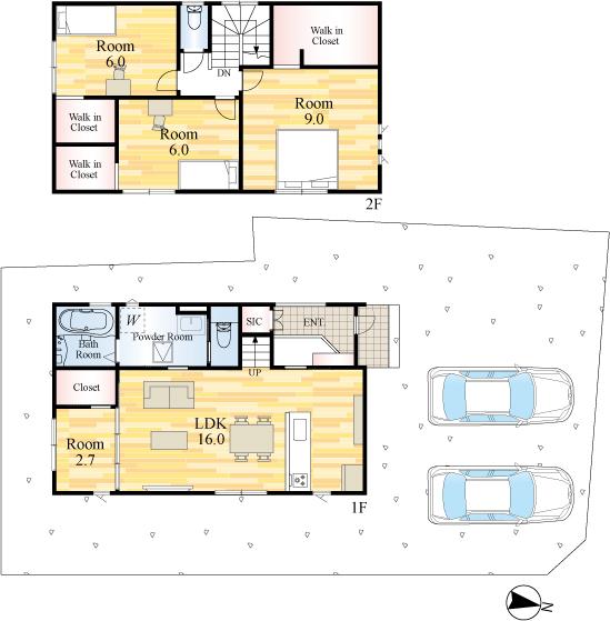 | 建物面積 | 101.44㎡・109.1㎡(30.68坪・33.00坪) | 土地面積 | 169.41㎡・189.21㎡(51.24坪・57.23坪) | ||