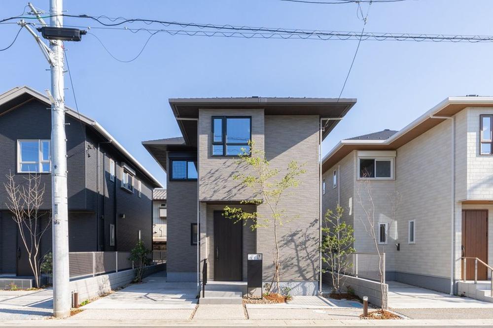 46号地は、グレーの外壁をベースにシックで落ち着いた印象の外観デザインとなっています。駐車は最大2台可能です。(車種による)