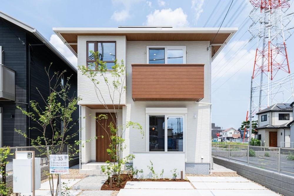 35号地は、爽やかな白の外壁に木目のブラウンが映える外観デザインとなっています。駐車は最大2台可能です。(車種による)