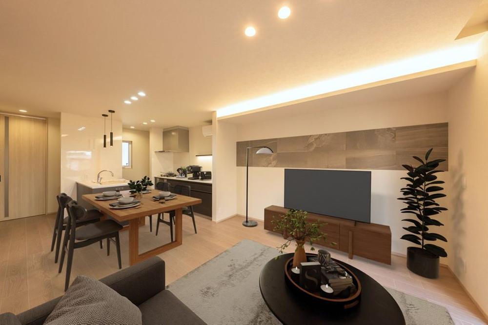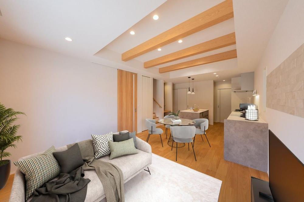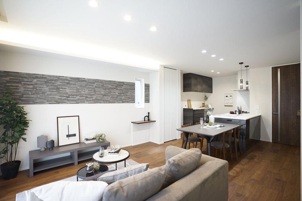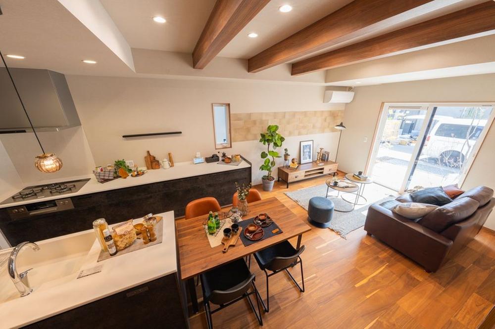 ■20号地LDK木材とレンガ調のエコカラットを用い、カフェのような雰囲気にしあげた20号地のLDK。あらわし梁を設え高さのある天井は、開放的な空間です。※CG合成で家具を設置
