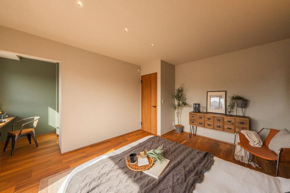■主寝室(19号地)落ち着いたグリーンのアクセントウォールと間接照明が上質な空間を演出する主寝室です。