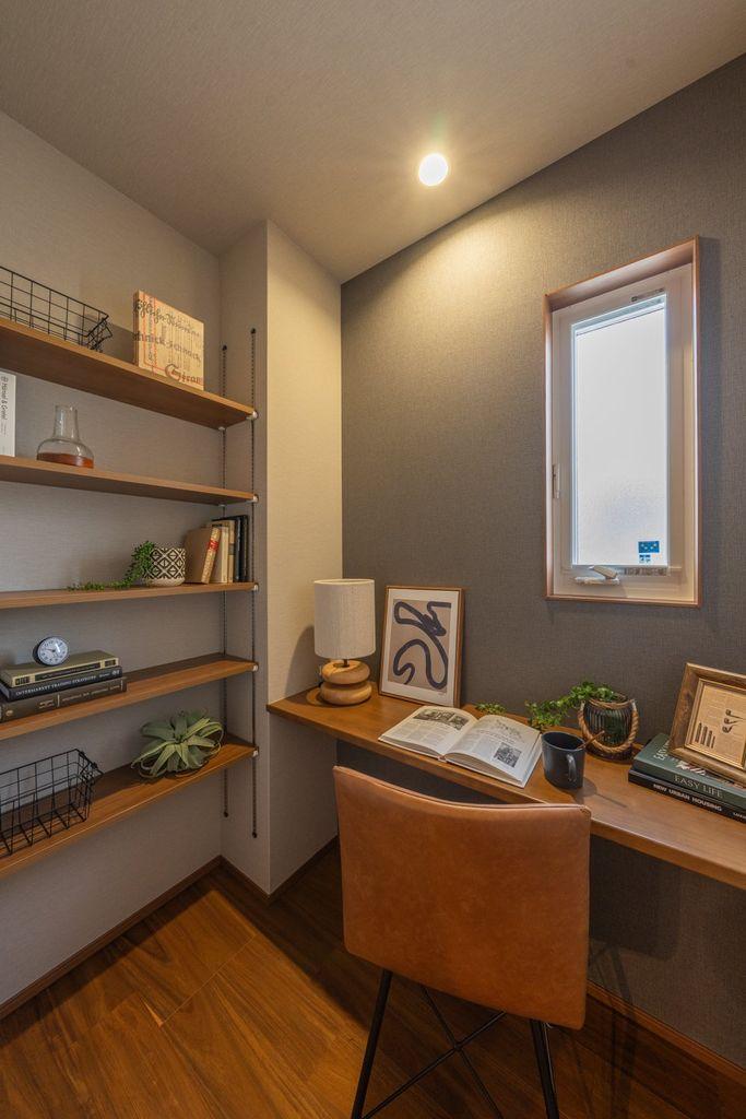 ■ワークコーナー(19号地)リビング横にあるワークコーナーです。壁付けの棚は、仕事道具や趣味のコレクション、写真などを飾ることもできます。