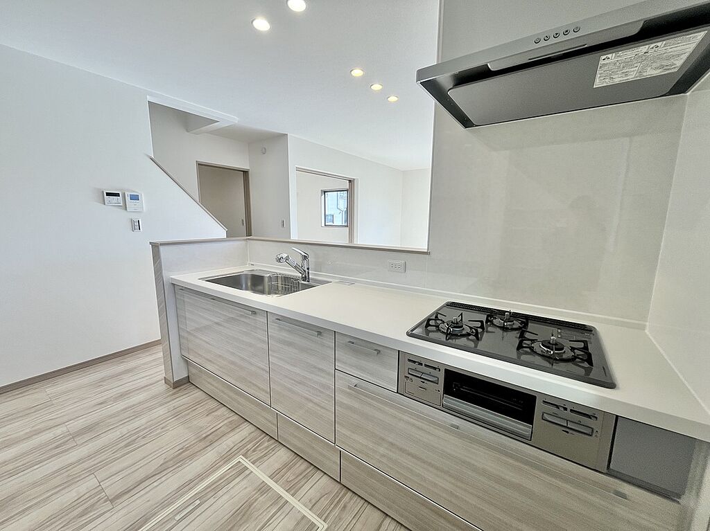 あると嬉しい備え付けのカップボード標準装備。壁に直接施工し耐震ラッチの働きなどによって地震の際の倒壊・食器雪崩を防止することで、安心してお使い頂ける仕様となっております。※物件によって取付の有無および形状は異なります。