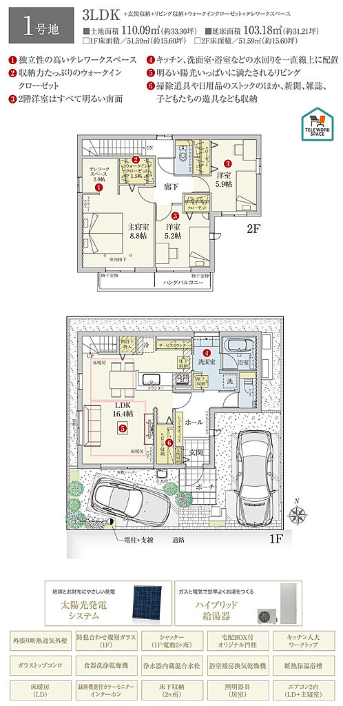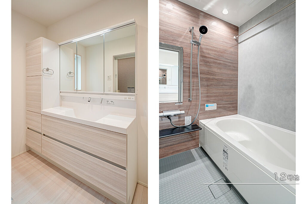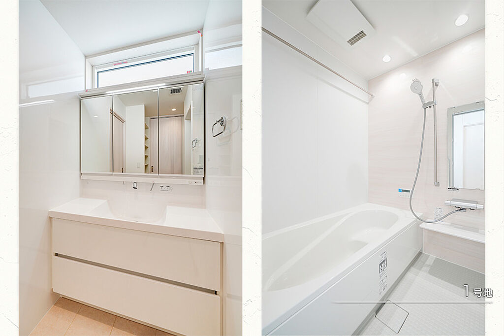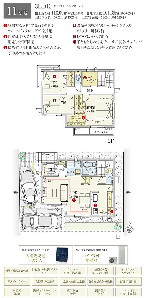 | 建物面積 | 103.18m2(1号地)、102.68m2(6号地)、101.35m2(11号地)、97.20m2(12号地) | 土地面積 | 110.09m2(1号地)、112.88m2(6号地)、110.09m2(11号地)、126.19m2(12号地) 私道負担なし | ||
