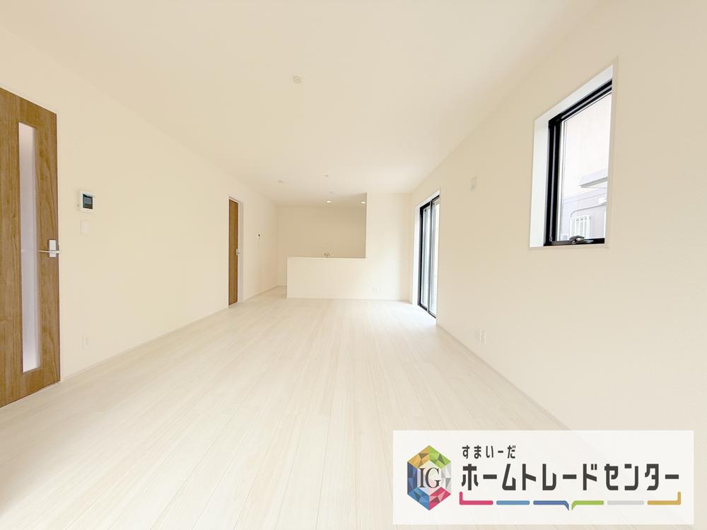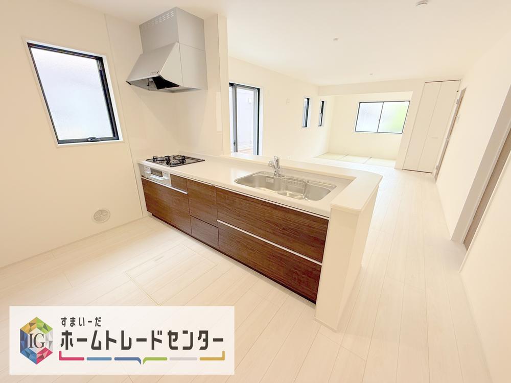 キッチンからリビングへの視界、動線です。対面キッチンですので、常にご家族が視界に入るのはもちろん、動線を広めにとっておりますので、お料理やお皿を持ちながらすれ違ってもぶつかる心配がありません。