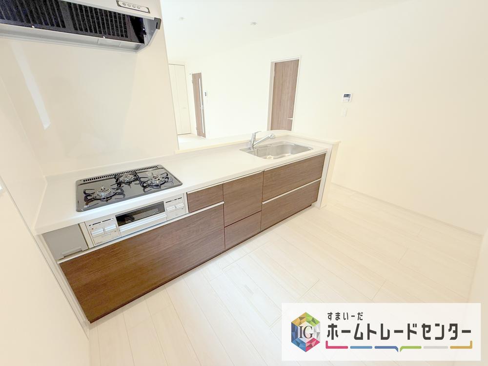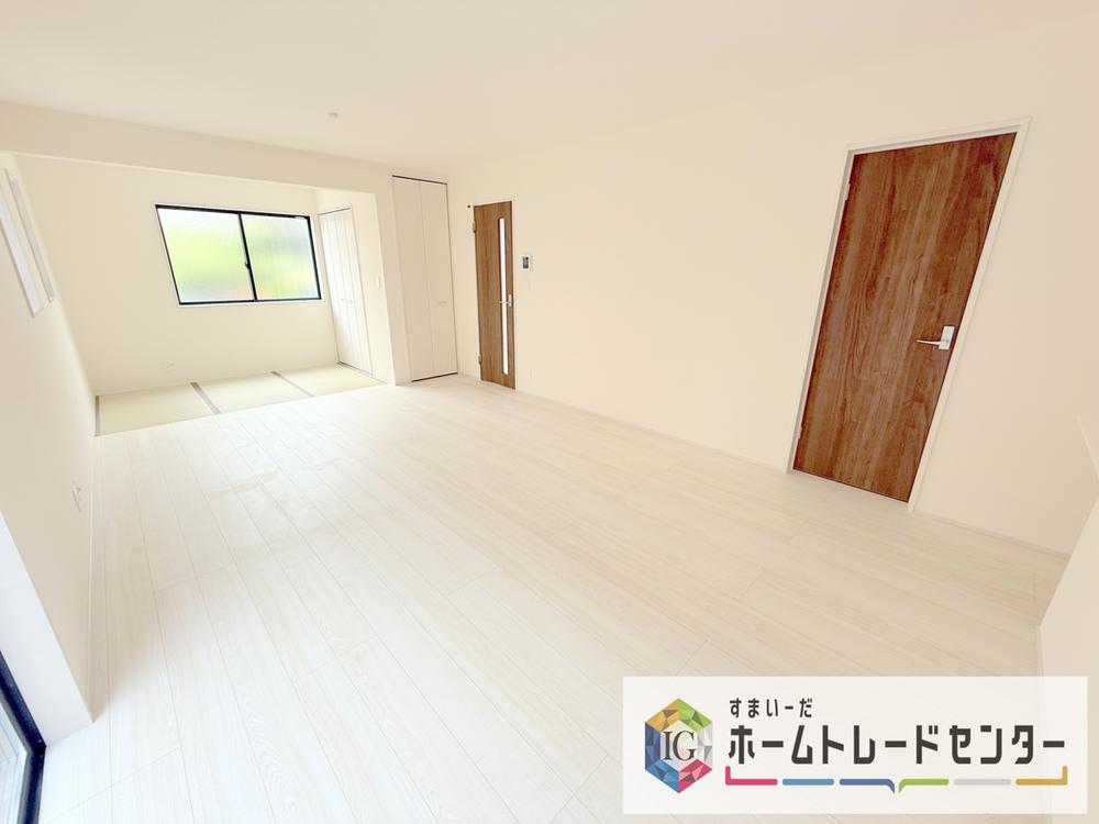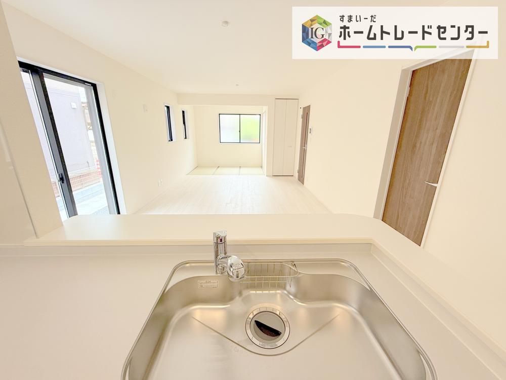 キッチンからリビングへの視界、動線です。対面キッチンですので、常にご家族が視界に入るのはもちろん、動線を広めにとっておりますので、お料理やお皿を持ちながらすれ違ってもぶつかる心配がありません。