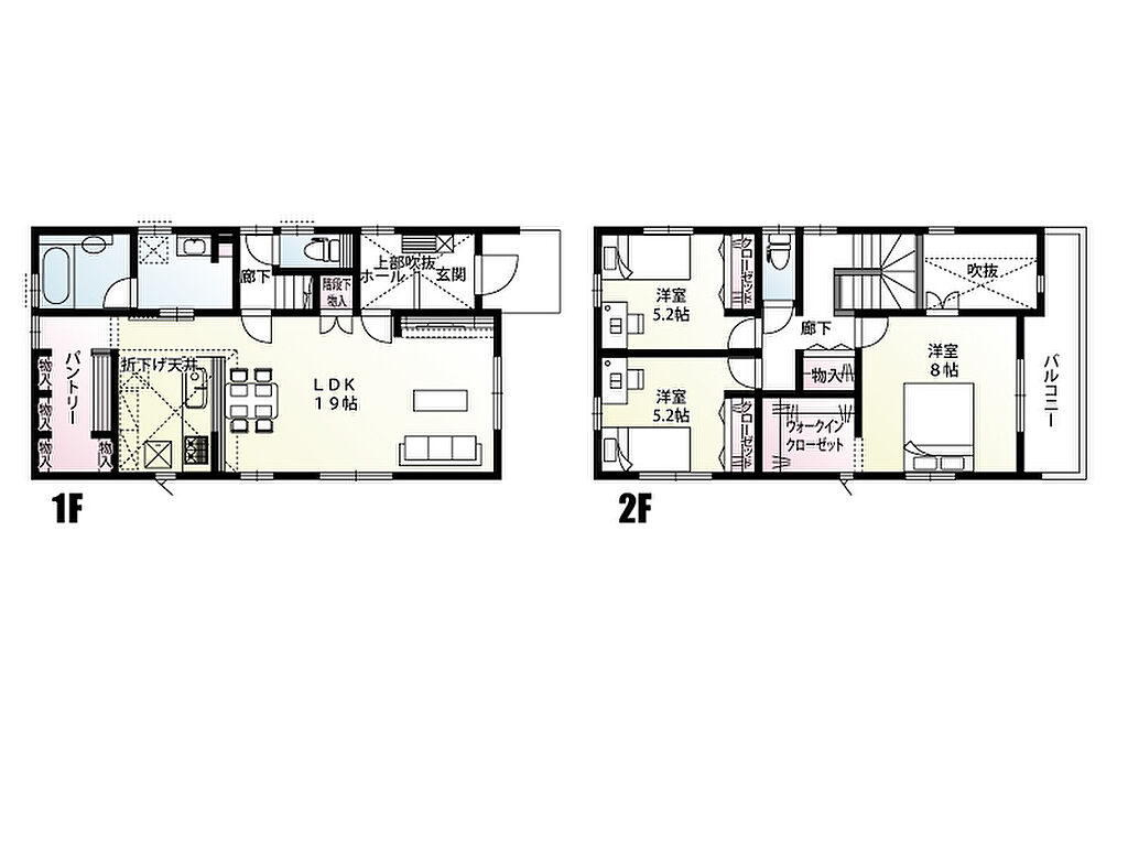 | 建物面積 | 98.46m2(1号棟)・97.73m2(4号棟)・104.33m2(5号棟) | 土地面積 | 115.76m2(1号棟)・113.60m2(4号棟)・143.61m2(5号棟) | ||