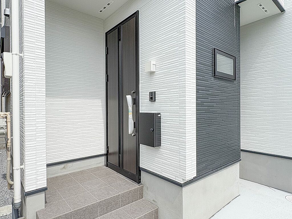 1号棟【玄関】家の顔となる玄関は、高いデザイン性が求められます。高級感と断熱性、防犯性に優れた玄関ドアを標準装備。ピッキング対策のセキュリティサムターン等、防犯に考慮しました。