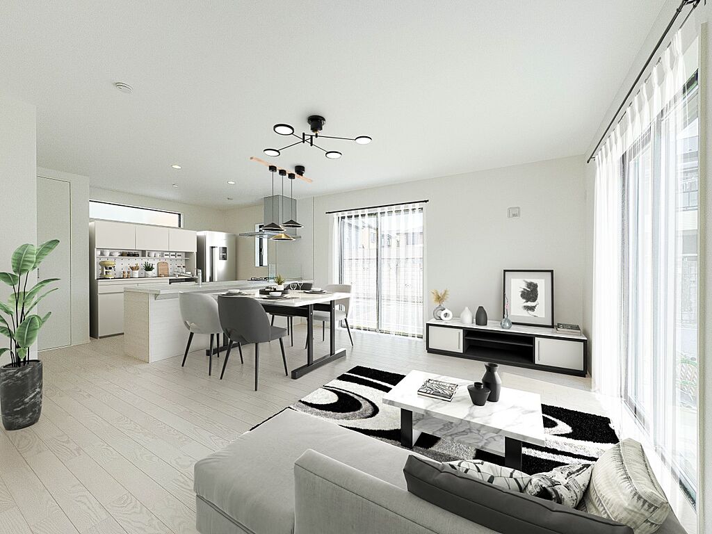 1号棟【LDK17.12帖】シンプルなデザインの家は風情がある。住む人のこだわりを感じる。居心地がよく、家事や趣味、子育てなどにも集中できる。※物件写真に、CGによる画像処理(家具等の配置)…