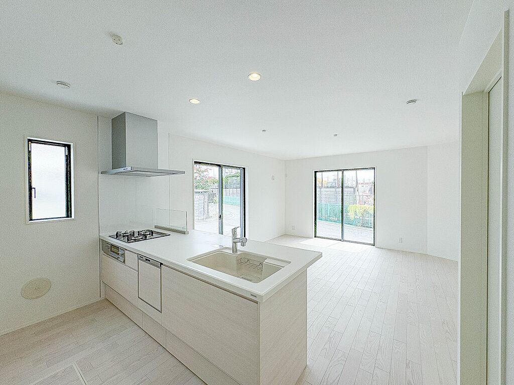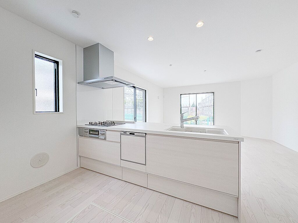 1号棟【キッチン】ナチュラルな自然光の中での調理。会話が弾む対面型キッチン。お洒落な食器類を余裕で収納できるスペース。動きやすい女性目線のキッチン動線。これからはお料理をつくる時間が劇的に変…