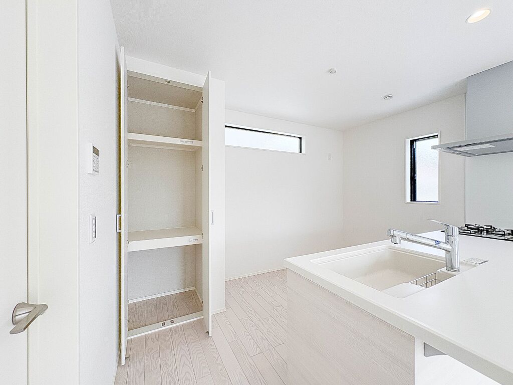 1号棟【パントリー(食料庫)】 常温保存できるパン、お米、調味料、缶詰など、日常的に使うものや未開封の食品の収納にぴったり。棚にものを並べて収納すれば、何が足りないのかひと目で確認できます…