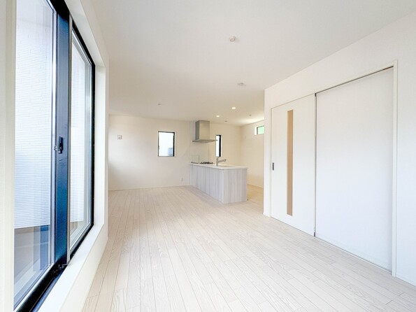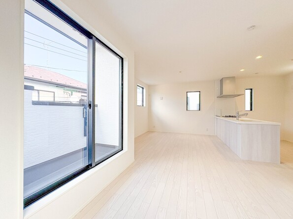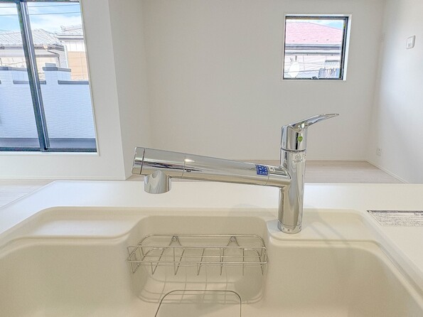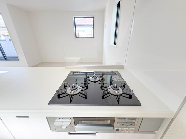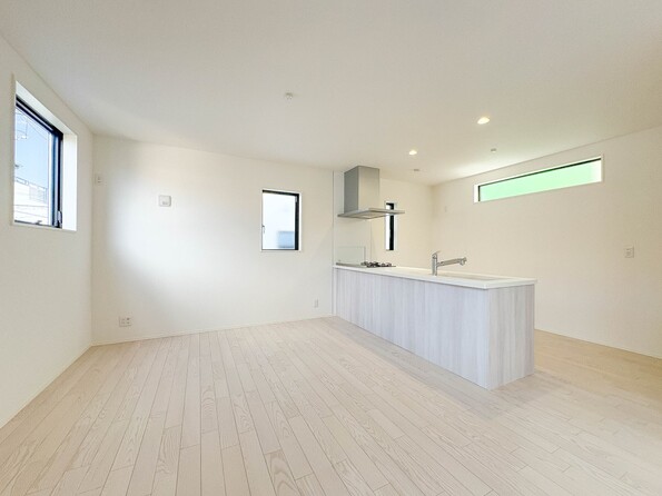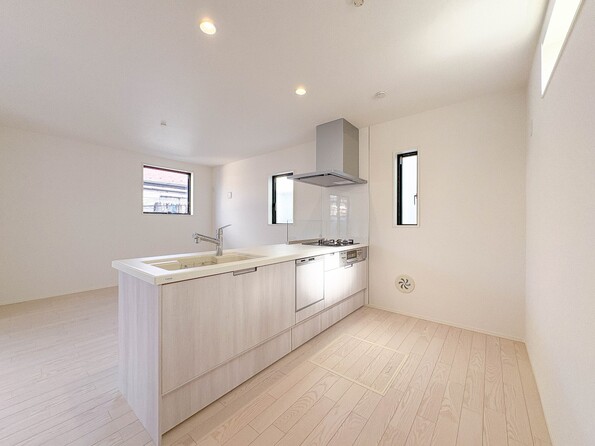 1号棟【キッチン】ナチュラルな自然光の中での調理。会話が弾む対面型キッチン。お洒落な食器類を余裕で収納できるスペース。動きやすい女性目線のキッチン動線。これからはお料理をつくる時間が劇的に変わります。