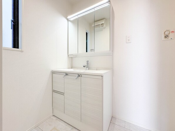 1号棟【三面鏡洗面化粧台】 ミラーを手前に引けば、楽な姿勢で髭剃りやメイクができます。合わせ鏡にすればヘアスタイルのチェックもラクラク。洗面化粧台のミラー裏にはたっぷり入る収納スペースを設けています