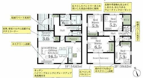 | 設備 | 収納スペース・追焚機能・プロパンガス・フローリング・浴室乾燥機・Wクロゼット・ウォシュレット・システムキッチン・カウンターキッチン・モニタ付インターホン・トイレ2ヶ所・床下収納・複層ガラス・電気・上水道・下水道 | ||||