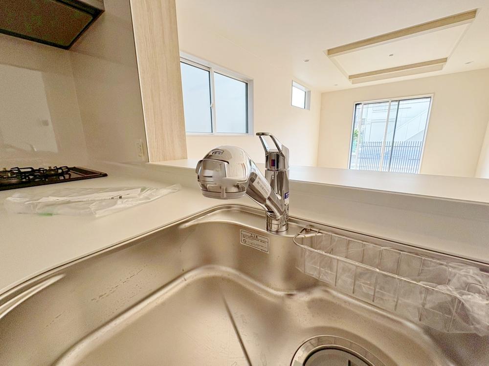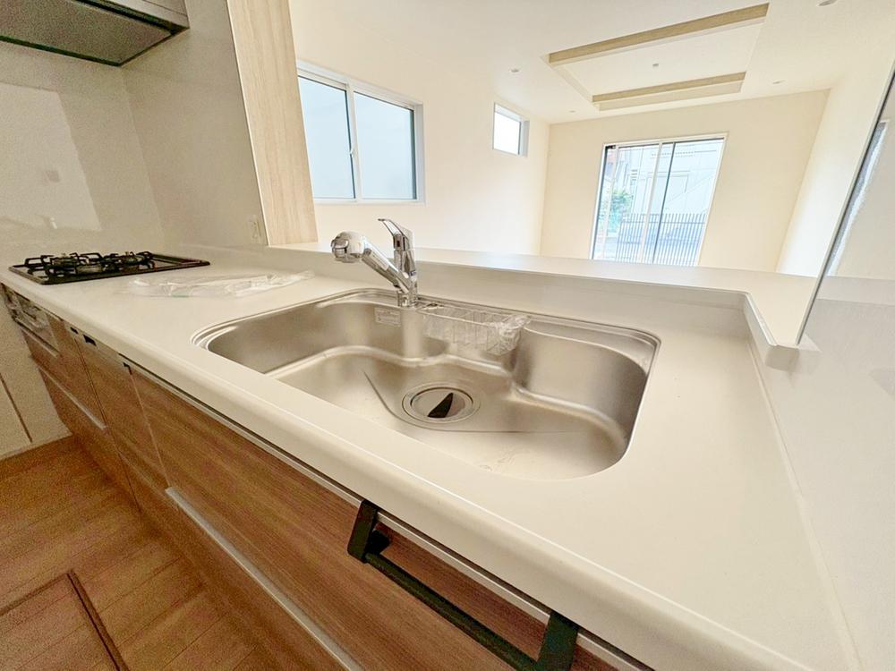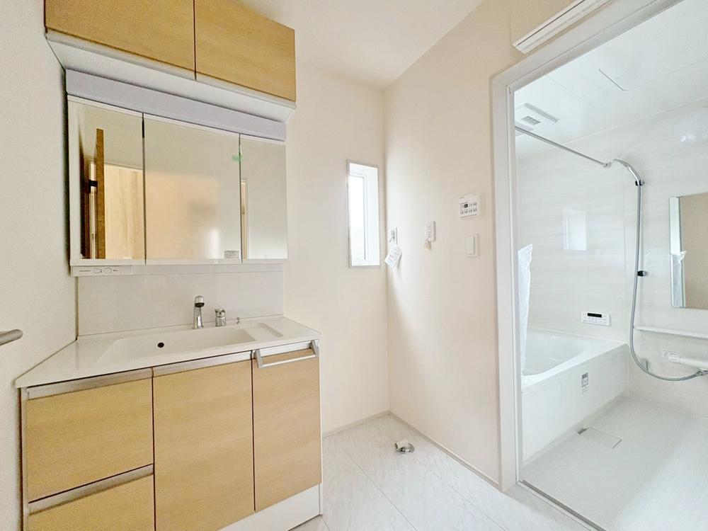 大きく見やすい三面鏡で清潔感ある洗面台。収納も多く、コスメ等もスッキリと仕舞えます。キッチンに隣接した位置関係ですので、家事動線もよく、ご家族のコミュニケーションが生まれ易い配置となっています。