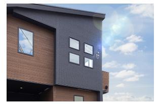 雨水で汚れを落とすセルフクリーニング機能付きサイディング外壁。空気中の水分子を取り込んで外壁表面に薄い水分子膜を作り、汚れの元となる物質を水分子膜の上に付着させます。雨が降れば、汚れは雨とともに洗い流され、外壁はいつもスッキリ。