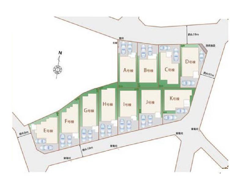 | 建物面積 | 90.1㎡~95.68㎡(27.25坪~28.94坪)(実測) | 土地面積 | 102.03㎡~109.1㎡(30.86坪~33.00坪)(実測) | ||