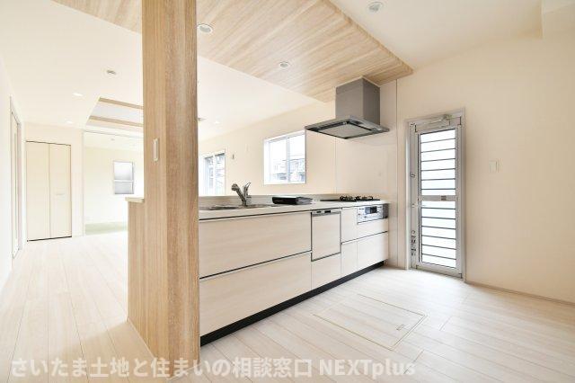 木目調のポップアップ天井がおしゃれなキッチン!奥行きも横幅も広さがありますので、2人でお料理しても動きやすいゆったり空間です!カウンターキッチンはお料理をしながら家族の様子が見えるので人気な設備です!
