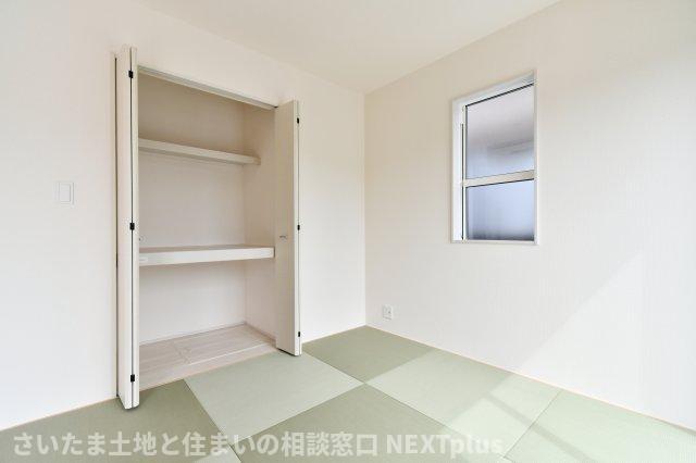 和室4.5帖:2面採光の明るい和室です。押入タイプの収納ですので、収納力も高く来客用の寝具もそのまま収納出来ます!畳ですので、フローリングより暖かく柔らかい為、寝る人にも優しいお部屋となっております。