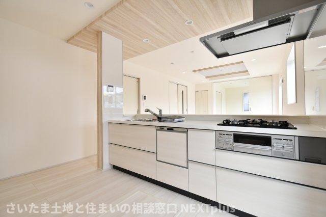 木目調のポップアップ天井がおしゃれなキッチン!奥行きも横幅も広さがありますので、2人でお料理しても動きやすいゆったり空間です!カウンターキッチンはお料理をしながら家族の様子が見えるので人気な設備です!