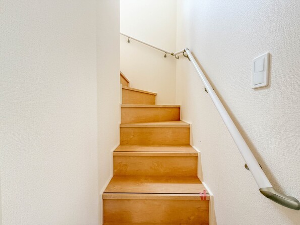 1号棟【手すり付階段】手すりがないと階段の昇り降りで危険なことはもちろん、壁に手をつきながら歩くことで壁紙が汚れやすくなります。すべての方に快適に昇り降りしていただくため、手すりを設置しました。