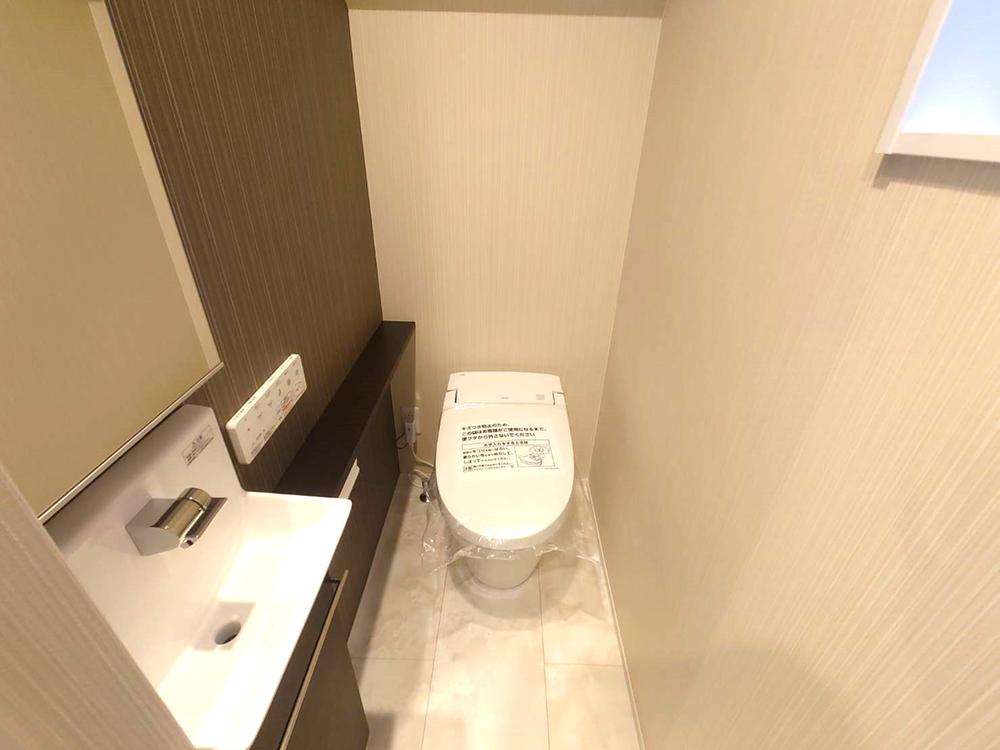 メーカー:リクシル タンクレス、便器はフチのないデザインでお掃除ラクラク!手洗い器上部にはトイレットペーパーやお掃除用具をきれいに収納でき、スッキリとした空間に。自動でフタが開き、使い勝手も抜群!
