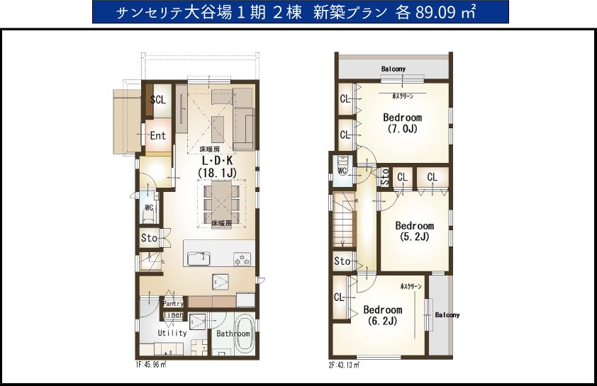 建物面積 | 89.09㎡ | 土地面積 | 87.38㎡ | ||