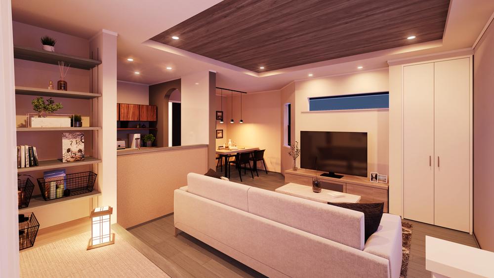 【A号棟 室内完成予想図】小上がりのタタミスペースはホッとひと息つける落ち着くスペースです。下は引出し式の収納になっているので、お子様のおもちゃや着替えなどサッと取り出したい物の収納に便利です。