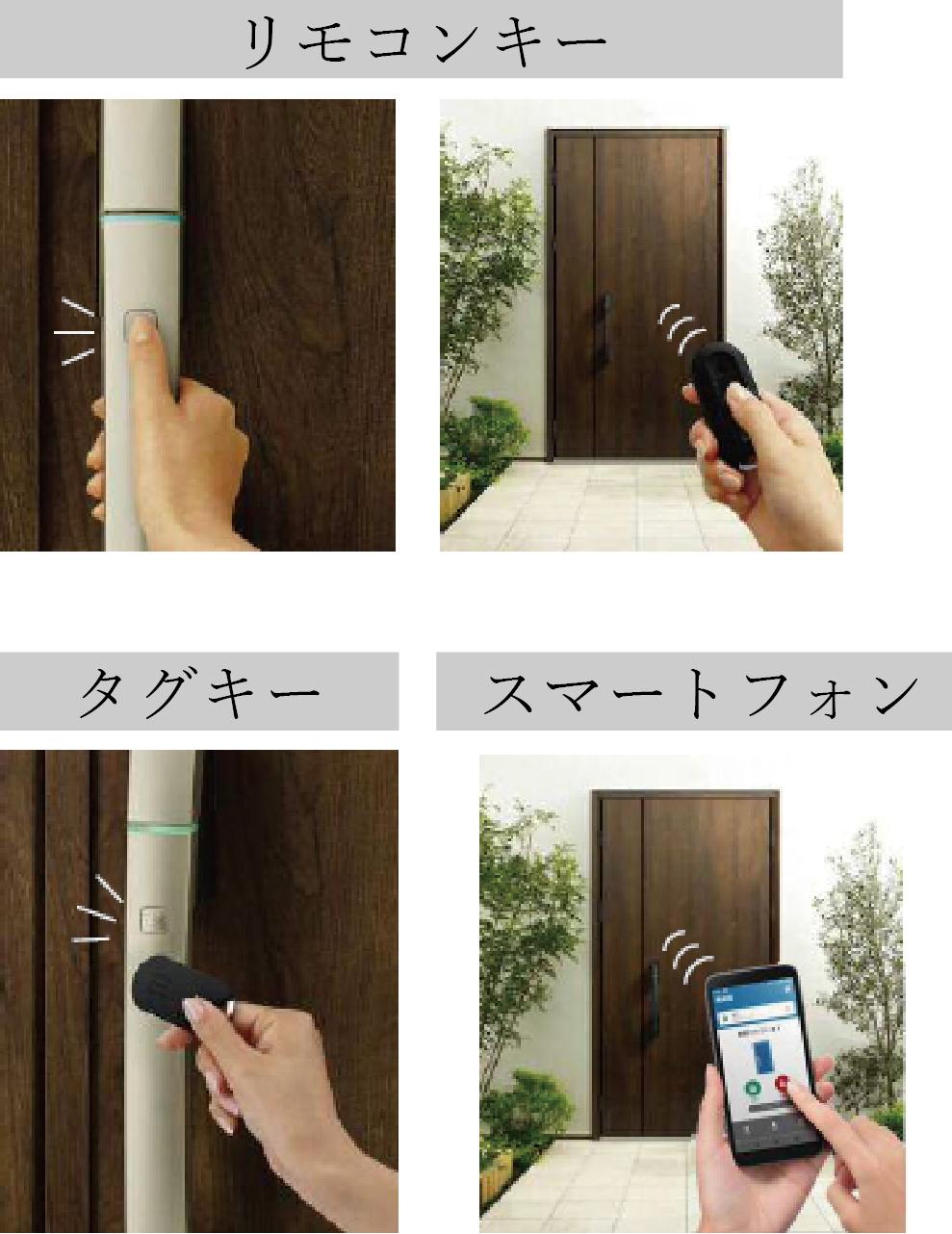 毎日の出入りが快適になる電子錠を採用しています。タグキーはハンドルに近づけて、リモコンキーはリモコンを携帯してハンドルのボタンを押すだけ、スマートフォンからアプリの操作でも施錠・開錠をおこなうこともできます。