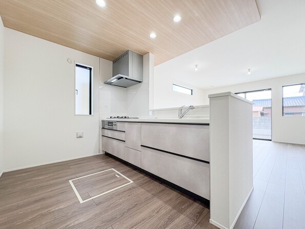 【キッチン LDK17帖】ナチュラルな自然光の中での調理。会話が弾む対面型キッチン。お洒落な食器類を余裕で収納できるスペース。動きやすい女性目線のキッチン動線。これからはお料理をつくる時間が劇的に変わ