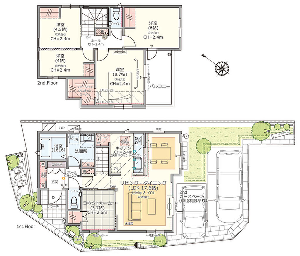 【心地良い空を感じ絆を紡ぐ2邸の住まい】コミュニティや快適性を創出するエクステリアを採用した開放的な街区。2台カースペースやサイクルスペースを確保し、建物や庭にゆとりを創出しています。