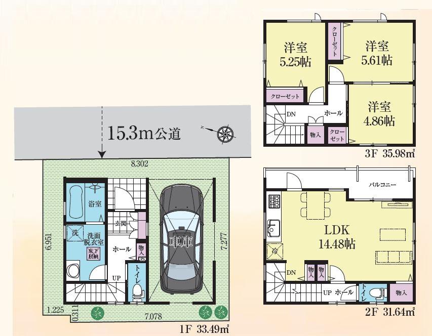 建物面積 | 101.11㎡(30.58坪)、うち1階車庫16.1㎡ | 土地面積 | 60㎡(18.14坪) | ||