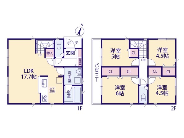 詳細を見る間取り4LDK〜5LDK(4LDK対応可※有償工事)+パントリー&ブレイクスペース+室内物干+セカンドシンク+土間収納+階段下収納+スッキリーナクロゼット+ウォークインクロゼット建物面積106.82m²~112.82m²土地面積土地:105.08m2〜120.04m2 / 私道負担なし 建物:106.82m2〜112.82m2築年月-